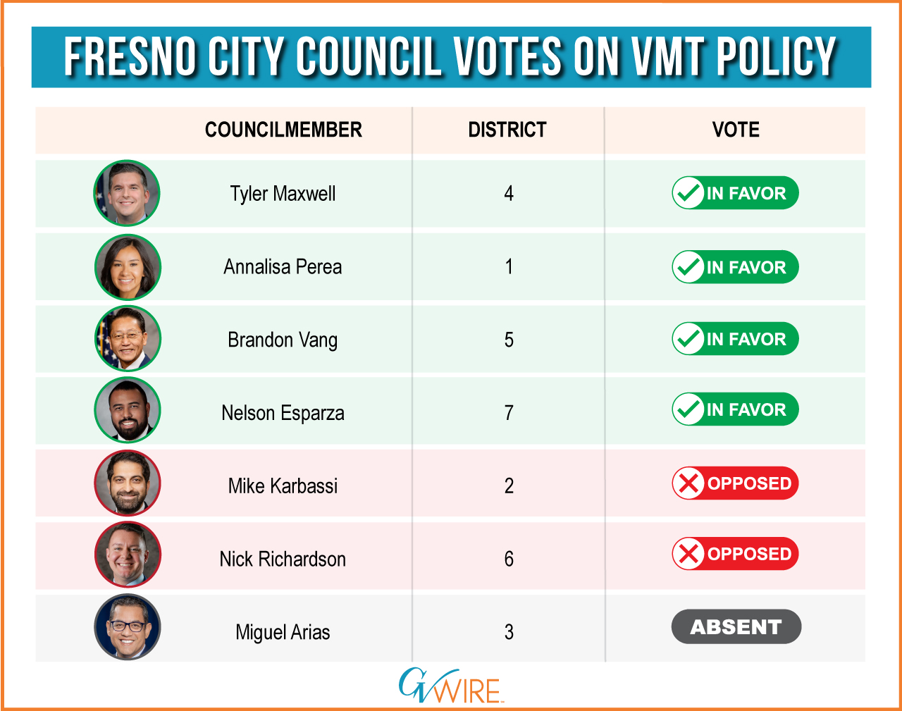 Fresno City Council approved its VMT plan 4-2-1, with Karbassi and Councilmember Nick Richardson opposed. Councilmember Miguel Arias was absent.