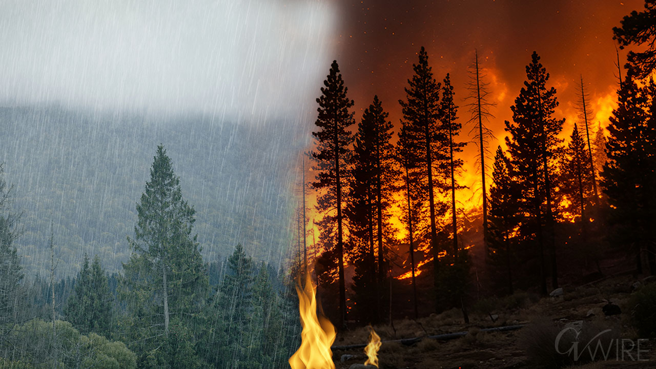 A fast-moving wildfire in Mono County has burned 3,400 acres and forced evacuations as Southern California braces for heavy rain that could cause flooding and mudslides in areas scarred by January’s deadly wildfires. (GV Wire Composite/Paul Marshall)
