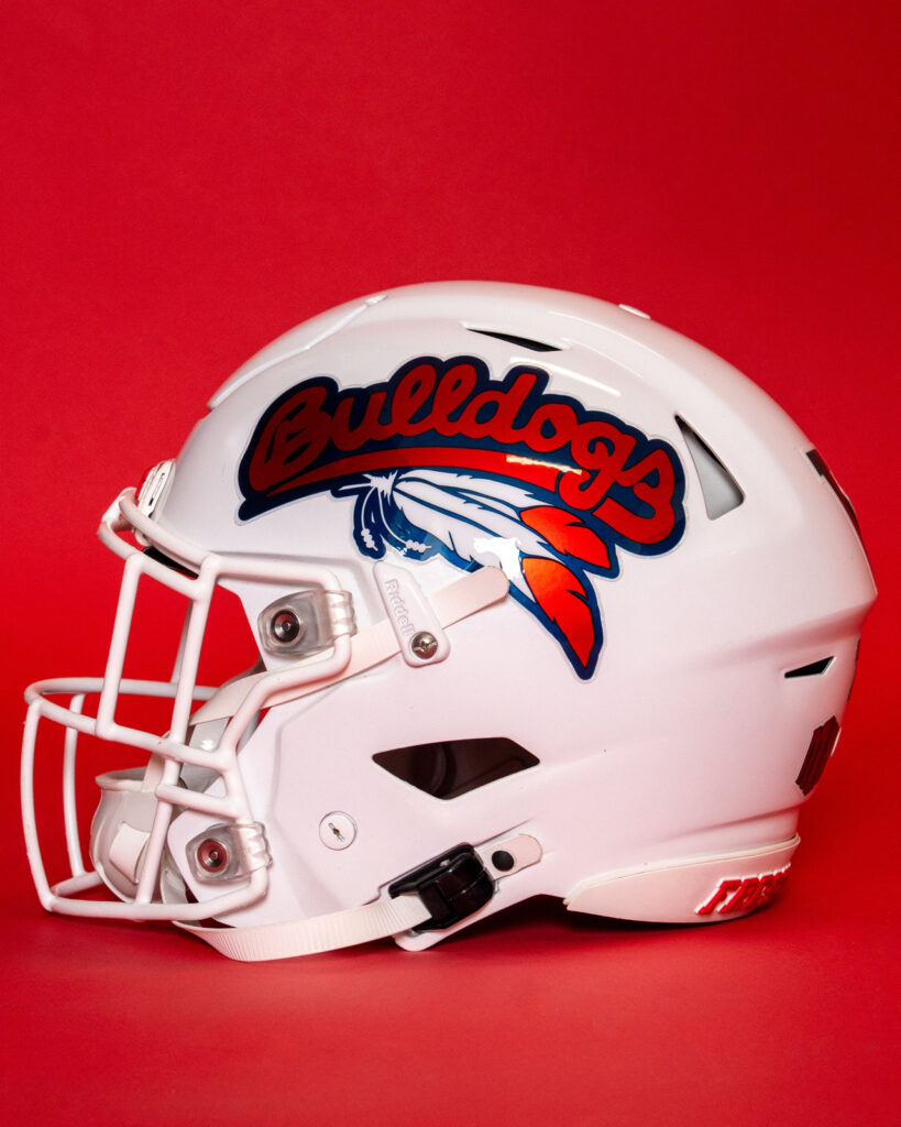 The Bulldogs wore white helmets with the Bulldog script and Native American feathers.