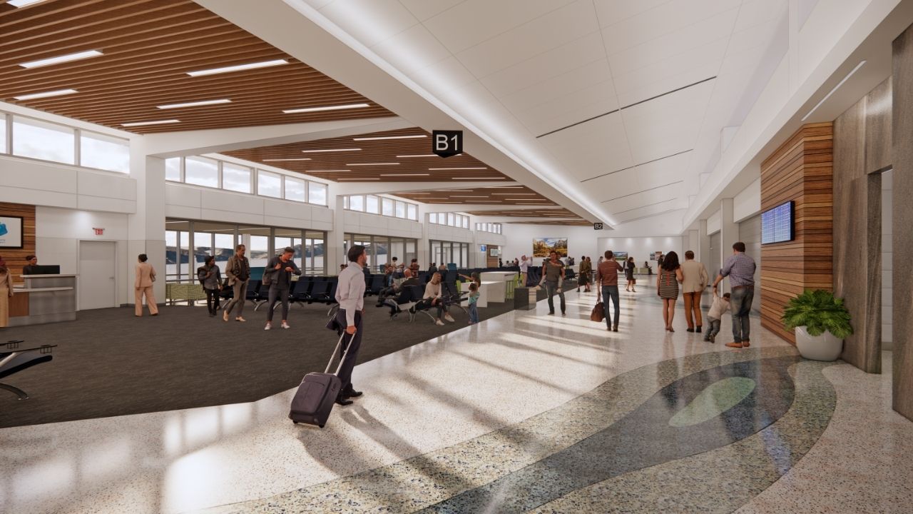 The airport project includes a new terminal, baggage handling area, an international arrival and screening area, and an already opened 900-space parking garage.