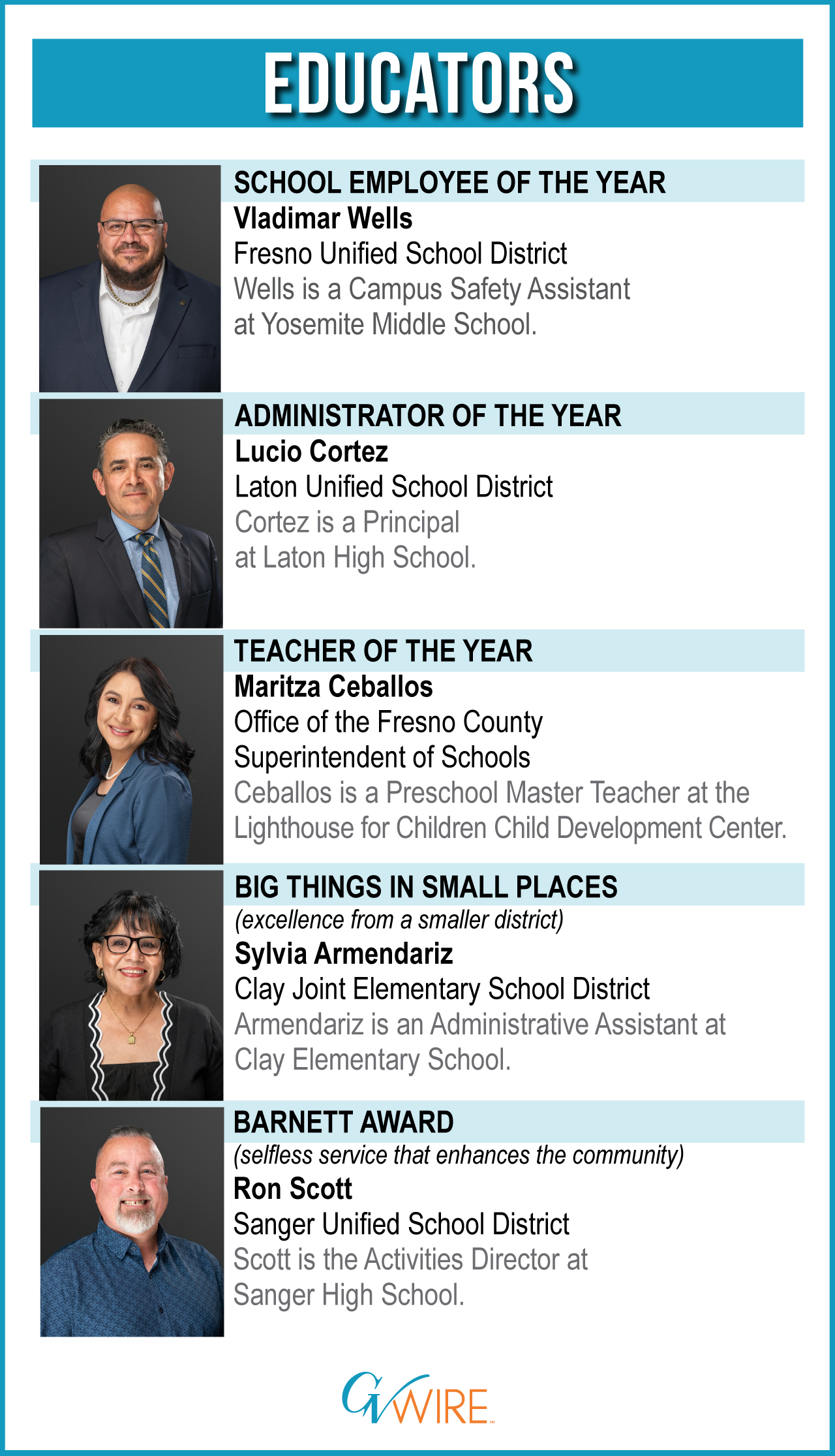 Vladimar Wells, Fresno Unified School District: Wells is a campus safety assistant at Yosemite Middle School. He has worked in education for 10 years. He is passionate about being a role model, emphasizing the importance of teamwork and positive reinforcement. Wells is known for his compassionate and caring nature, always accepting any challenge when a student is in need.