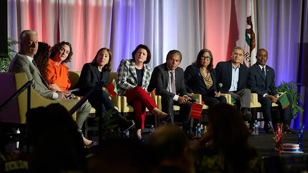 Democratic candidates for governor during a candidates' event hosted by the California Federation of Labor Unions, AFL-CIO, and the State Building and Construction Trades Council at the Sheraton Grand Hotel in Sacramento, May 12, 2025. The candidates in attendance were Katie Porter, Eleni Kounalakis, Toni Atkins, Antonio Villaraigosa, Betty Yee, Xavier Becerra, and Tony Thurmond. Kounalakis and Atkins have since dropped out. (CalMatters/Fred Greaves/File)
