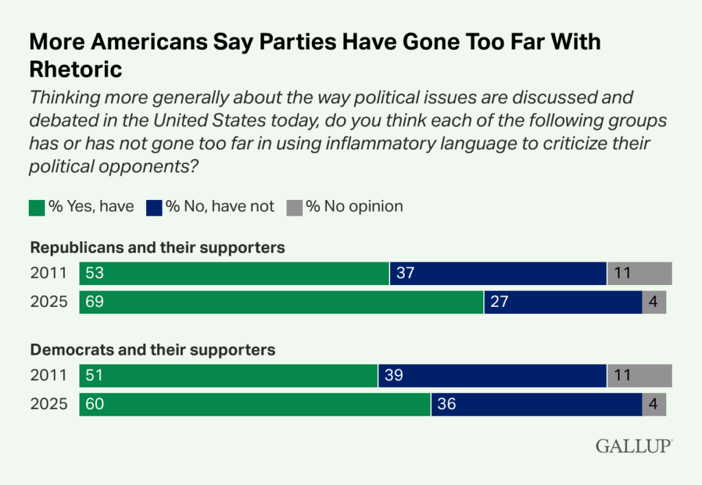 The survey shows 69% of Americans believe Republicans and their supporters have gone too far with inflammatory rhetoric, while 60% say the same of Democrats — sharp increases from 2011.