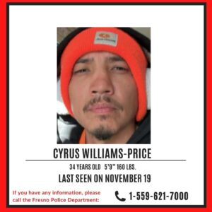 Fresno police are seeking the public’s help to find Cyrus Williams-Price, last seen Wednesday, Nov. 19, 2025, near Clovis Community Hospital. (Fresno PD)