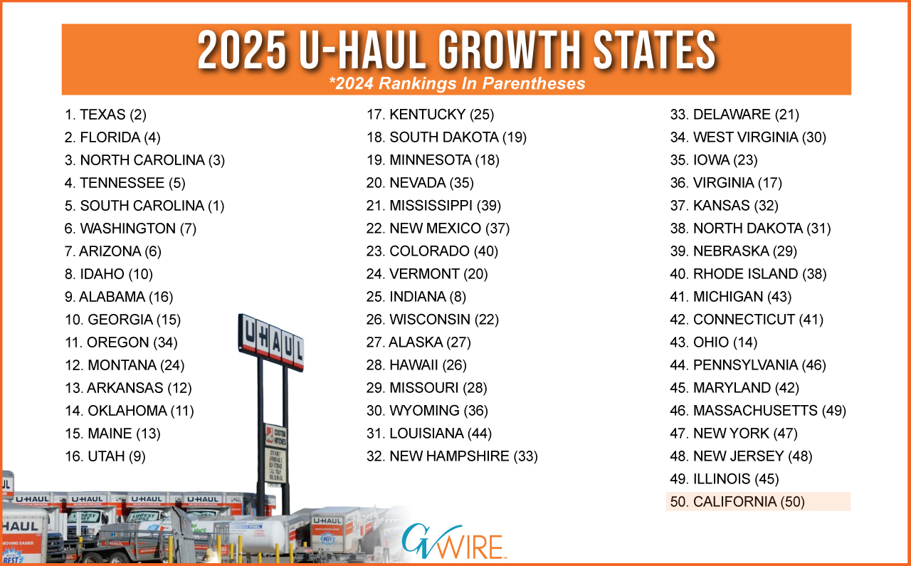 For the sixth year in a row, U-Haul data shows California as the biggest net loser of do-it-yourself movers. (GV Wire Composite)