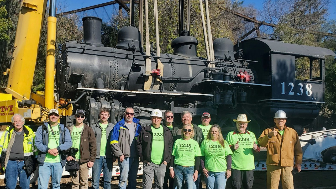 Friends of the Historic Kingsburg Depot gather on Monday, Jan. 12 2026 as the Southern Pacific Engine 1238 is loaded onto a truck for transport to the train museum. (Special to GV Wire)