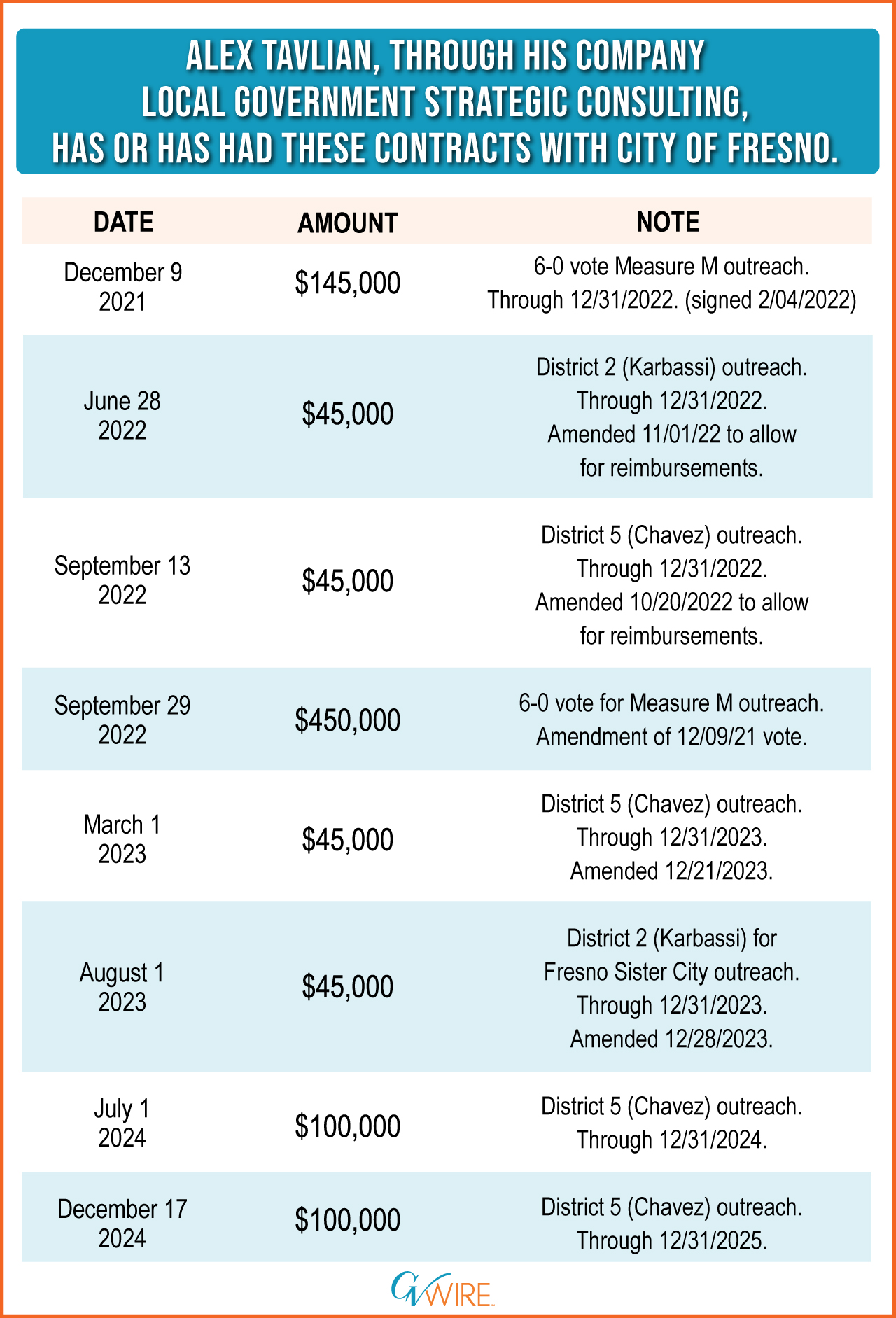 Tavlian’s firm also held outreach contracts with District 2 Councilmember Mike Karbassi in 2022 and 2023, valued at $45,000 each. Those contracts were not voted on by the city council because they were under $100,000.