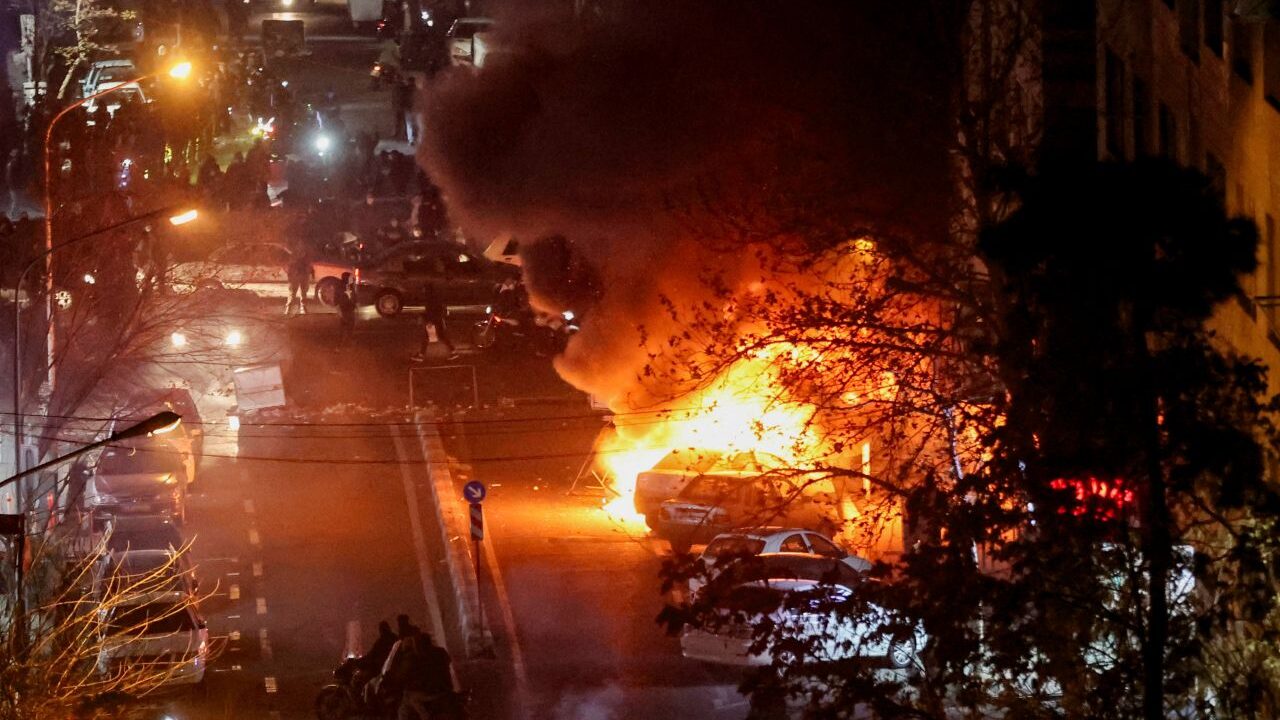 Cars burn in a street during a protest over the collapse of the currency's value, in Tehran, Iran, Jan. 8, 2026. (Stringer/WANA (West Asia News Agency) via Reuters/File)