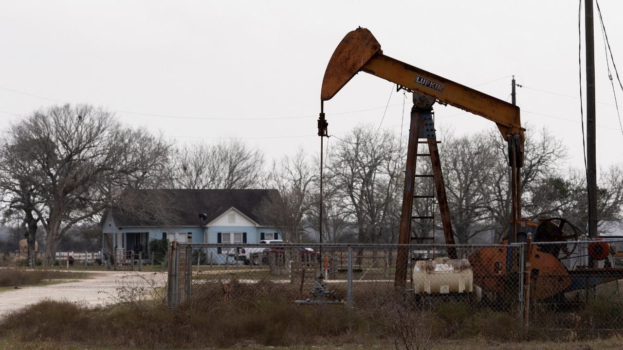 An oil pumpjack in front of a house in Ganado, Texas, U.S., January 8, 2026. (Reuters/Antranik Tavitian)