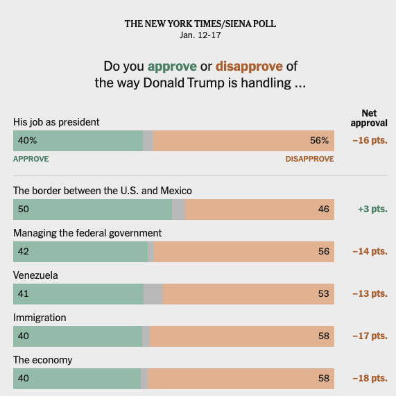 A majority of voters disapprove of how Trump has handled top issues including the economy, immigration, the war between Russia and Ukraine and his actions in Venezuela. And significantly, a majority of Americans, 51%, said Trump’s policies had made life less affordable for them.