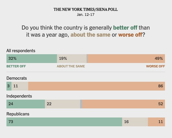 All told, 49% of voters said the country was worse off than a year ago, compared with 32% who said it was better.