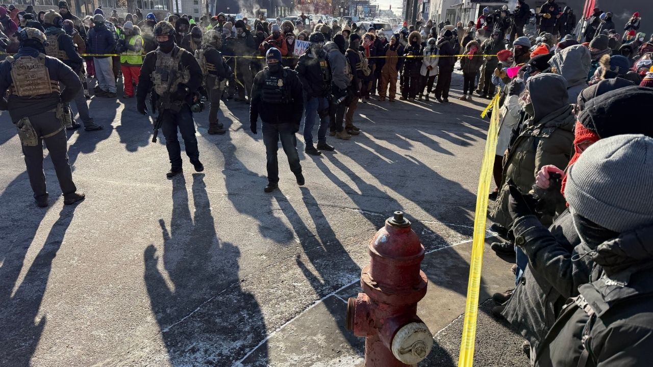 Demonstrators and civilians surround a perimeter held by federal agents near the intersection of 26th Street and Nicollet Avenue in Minneapolis, where federal law enforcement agents shot a person earlier on Saturday, Jan. 24, 2026. The scene was cordoned off with crime scene tape, as dozens of protesters, some wearing gas masks and goggles, blew whistles. ICE agents from Enforcement and Removal Operations were on site, as were several agents wearing U.S. Bureau of Prison Uniforms. (David Guttenfelder/The New York Times)