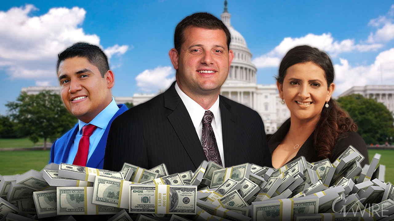Rep. David Valadao, R-Hanford, (center) is in the campaign fundraising lead for Congressional District 22. Randy Villegas (left) and Jasmeet Bains are competing to be the top Democrat in the race. (GV Wire Composite)