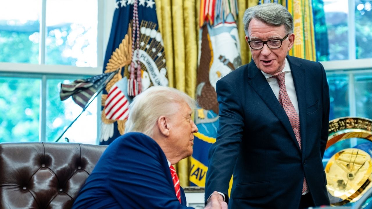 Peter Mandelson, the British ambassador to the U.S., shakes hands with President Donald Trump during the announcement of a trade agreement with Britain in the Oval Office of the White House in Washington, on Thursday, May 8, 2025. Newly released documents detailed connections between the convicted sex offender Jeffrey Epstein and Peter Mandelson, who was picked to be the U.S. envoy by the British prime minister, Keir Starmer. (Eric Lee/The New York Times)