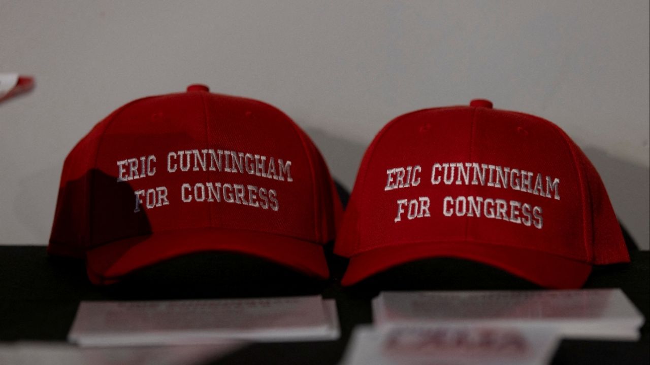 Political campaign hats for Eric Cunningham, a candidate in Georgia?s 14th Congressional District, are displayed at a political forum in Kennesaw, Georgia, U.S., February 10, 2026. (Reuters File)