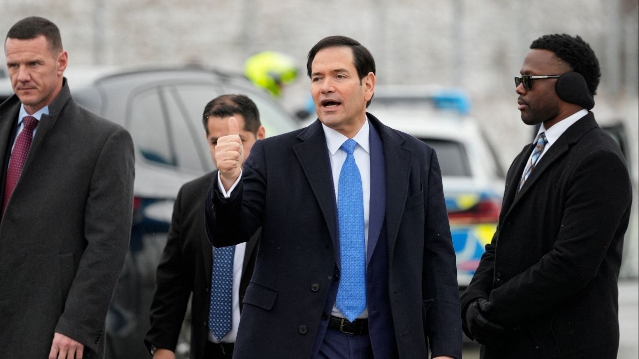 U.S. Secretary of State Marco Rubio gives a thumbs up as he departs Munich International Airport in Munich, Germany, Sunday, Feb. 15, 2026, after attending the Munich Security Conference. (Alex Brandon/Pool via Reuters)