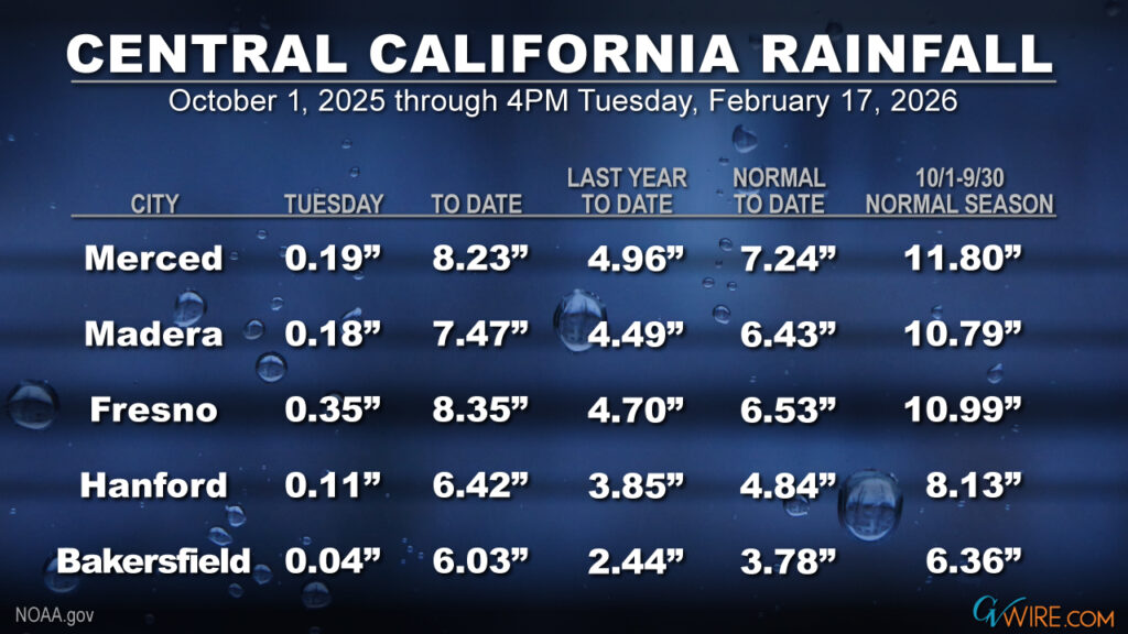 Fresno received nearly an inch of rain Tuesday, bringing its seasonal total to 8.35 inches. That compares to 6.53 inches, the historical average through Feb. 17. At the Valley’s southern end, Bakersfield has accumulated 6.03 inches of rain, nearly matching its normal season total of 6.36 inches with several months to go in the water season.