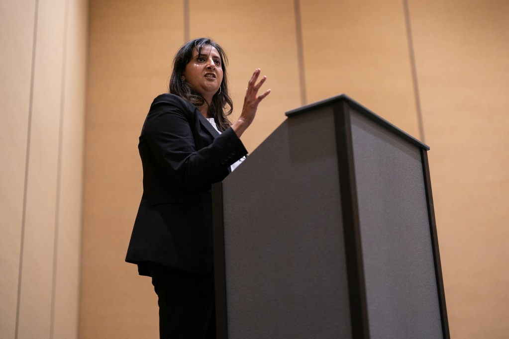 Assemblymember Jasmeet Bains, candidate for California’s 22nd Congressional District, speaks during a caucus meeting at the California Democratic Convention at Moscone West in San Francisco on Feb. 21, 2026. Photo by Jungho Kim for CalMatters