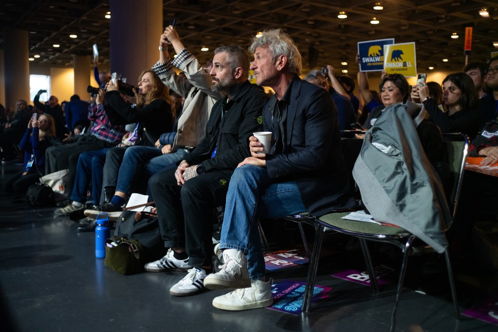 At right, actor Sean Penn watches U.S. Rep. Eric Swalwell, candidate for California governor, speak during the afternoon general session at the California Democratic Party convention in San Francisco on Feb. 21, 2026. Photo by Jungho Kim for CalMatters