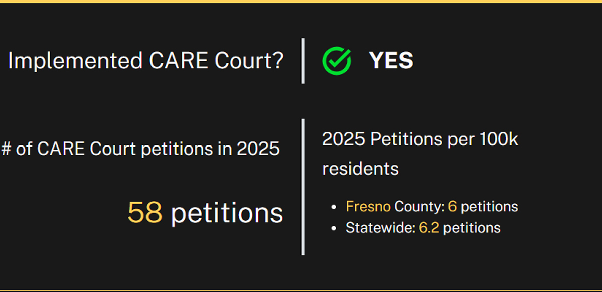 Since beginning the program in December 2024, Fresno County has issued 58 petitions, equaling about 6 petitions per 100,000 residents. That is slightly below the statewide average of 6.2 petitions per 100,000.