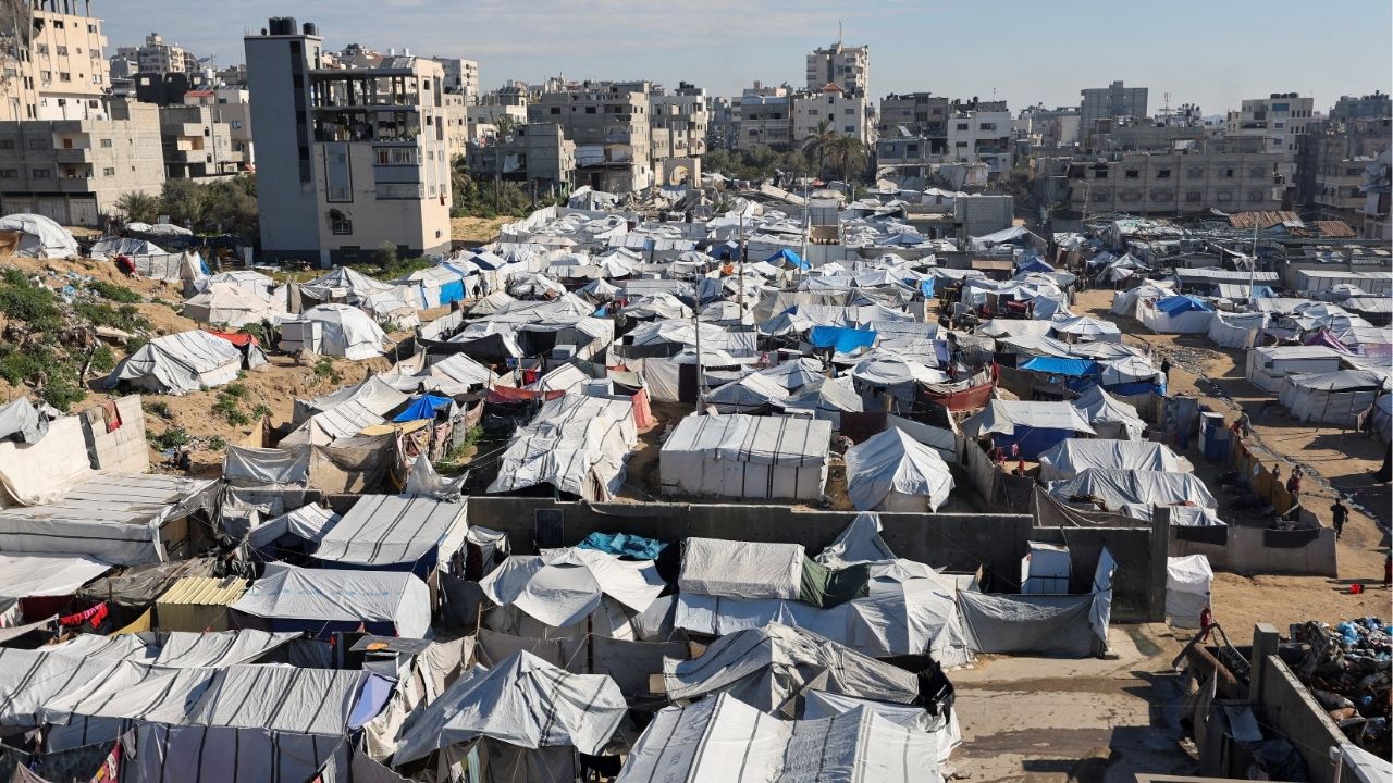 Palestinians displaced during the two-year Israeli offensive, shelter at a tent camp in Gaza City, March 1, 2026. (Reuters/Dawoud Abu Alkas)