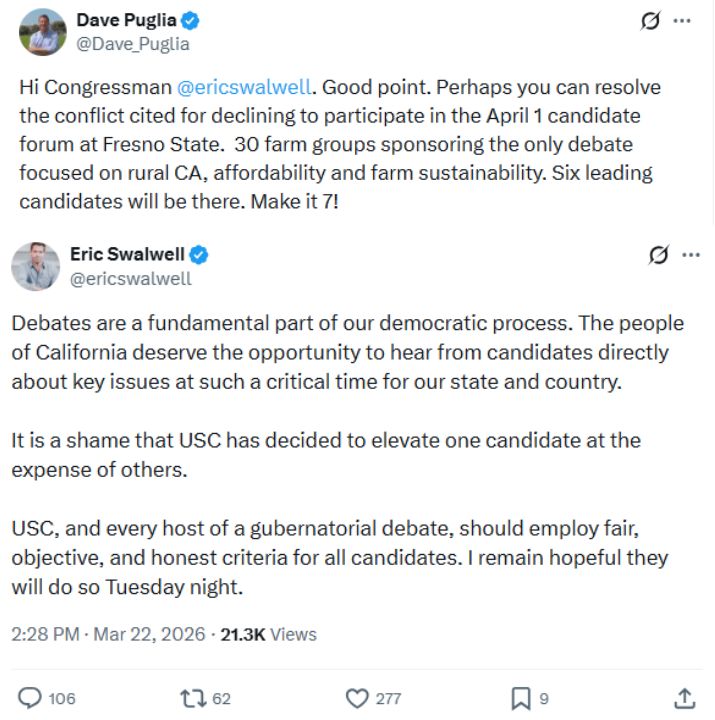 “Good point. Perhaps you can resolve the conflict cited for declining to participate in the April 1 candidate forum at Fresno State. 30 farm groups sponsoring the only debate focused on rural CA, affordability and farm sustainability. Six leading candidates will be there. Make it 7!” Puglia wrote.