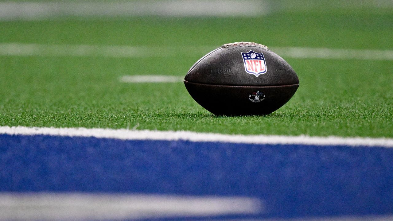 A view of the NFL logo on a football at the goal line during the second half between the East and the West at the Ford Center at the Star. (Jerome Miron-Imagn Images)