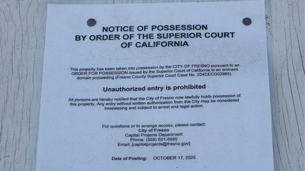 As part of a railroad grade separation project, the city plans to build an underpass at Blackstone and McKinley avenues next to Fresno City College. Several businesses at that intersection either accepted a settlement with the city to move or were forced out through eminent domain. The city acquired an eminent domain ruling against Art Terzian for his business A&T Ceramic at 1780 E. McKinley Ave. in 2024. A notice is posted on the otherwise boarded-up building.