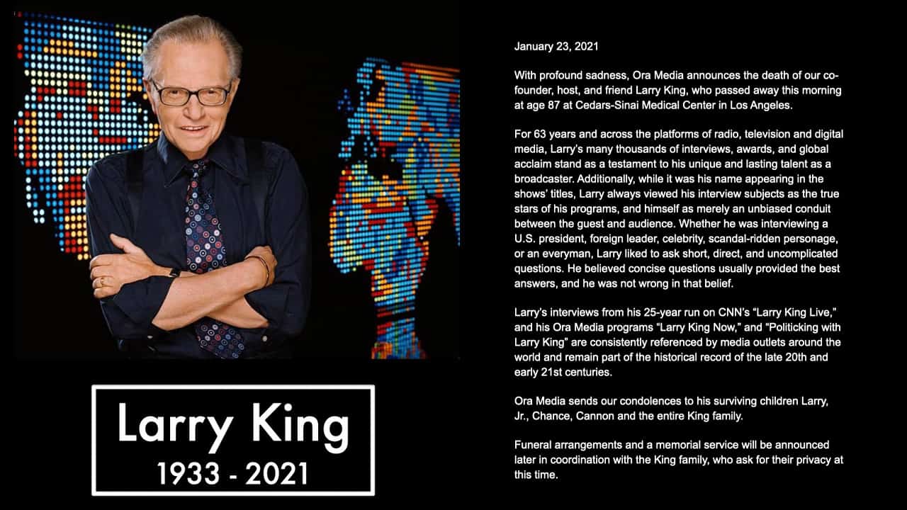 [aggregation-styles] ABC 30 LOS ANGELES -- Larry King, the suspenders-sporting everyman whose broadcast interviews with world leaders, movie stars and ordinary Joes helped define American conversation for a half-century, died Saturday. He was 87. King died at Cedars-Sinai Medical Center in Los Angeles, Ora Media, the studio and network he...